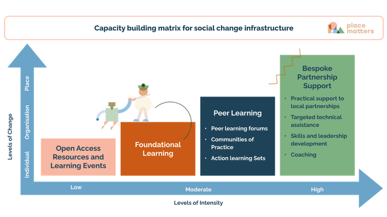 A shared understanding of practice: The field of place-based practice remains relatively immature in the UK, with limited points of reference for excellent practice, and competing narratives and tools. We need a common language and framework that builds on successful examples, allowing for distinctive approaches while building confidence in what works.