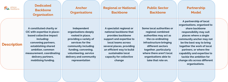 Dedicated backbone organisations have deep expertise in coordinating place-based work, evidence-based practice, and fundraising power. Often national organisations working in place for a defined period, they bring strong track records and the ability to mobilise significant resources. Examples include Right to Succeed and Thrive at Five. The challenge is sustainability and building a lasting local legacy when the organisation eventually moves on.