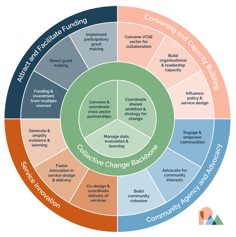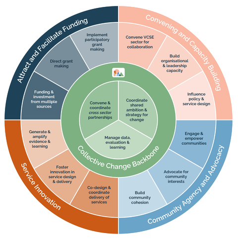 At the heart of this infrastructure is what's often called the Collective Change Backbone, the coordinating capability that turns shared ambition across policy priorities into sustained action. This provides both the capacity and capability for local change, and our view is that building this backbone function is a priority right now.
